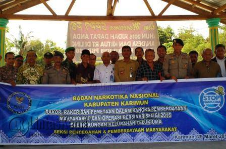 Karimun, LintasKepri.com – Dalam rangka pengentasan masalah kasus narkoba di Kabupaten Karimun, Badan Narkotika Nasional Karimun (BNNK) melaksanakan kegiatan Sosialisasi, Rakor, Raker dan pemetaan dalam rangka pemberdayaan masyarakat maupun Operasi Bersinar Seligi 2016 di Kelurahan Teluk Uma, Karimun, Selasa (29/3).