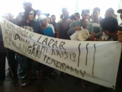“Berikan jaminan pekerjaan kepada kami para buruh bongkar muat yang sudah kehilangan pekerjaan semenjak tidak beroprasinya kapal Ekspor dan Impor, serta Kapal antar pulau secara optimal,” ungkap orator aksi buruh bongkar muat itu dalam orasinya.