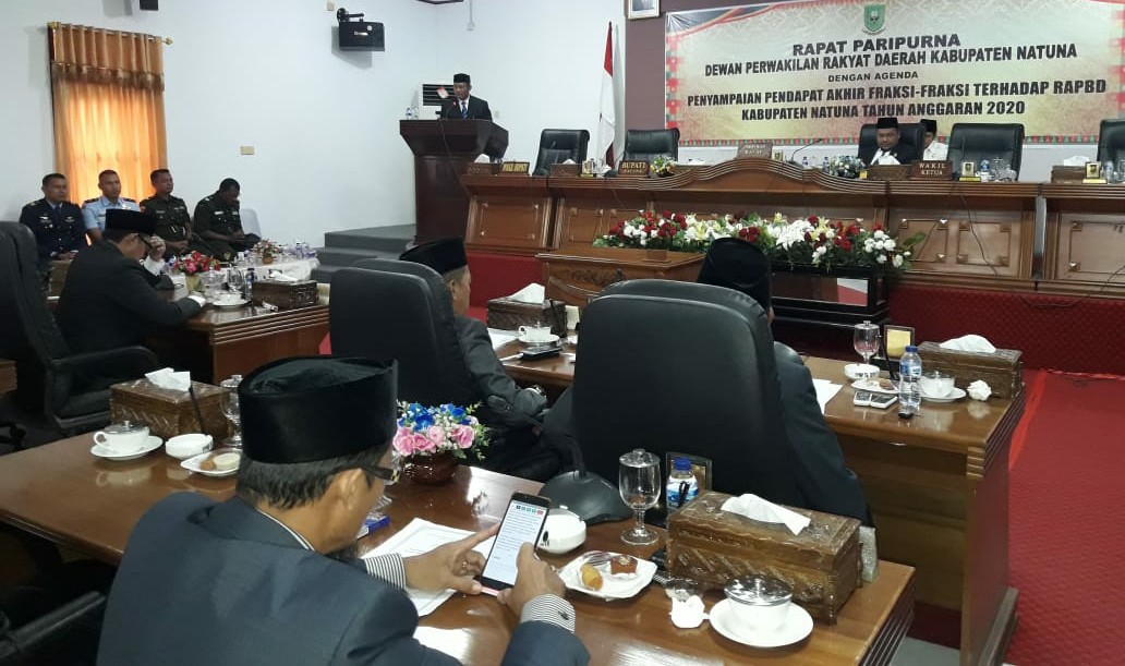 Dalam Rapat paripurna yang hanya dihadiri oleh sejumlah anggota DPRD, OPD, FKPD, tokoh masyarakat dan para tamu undangan lainnya tersebut, seluruh fraksi yang ada di DPRD Natuna setuju dengan rancangan APBD Natuna tahun 2020 yang disahkan sebesar Rp 1,35 triliun.