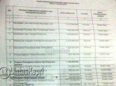 Tanjungpinang,LintasKepri.com – Berdasarkan copyan program kegiatan Dinas pendidikan (Disdik) Provinsi Kepulauan Riau (Prov Kepri) yang diperoleh LintasKepri.com pada tahun 2015 dibawah kepemimpinan Yatim Mustafa. Pemerintah Provinsi Kepri mengucurkan dana sebesar Rp 15.710.736.000, ( Lima Belas Miliar Tujuh Ratus Sepuluh Juta Tujuh Ratus Tiga Puluh Enam Ribu Rupiah) untuk dua program.