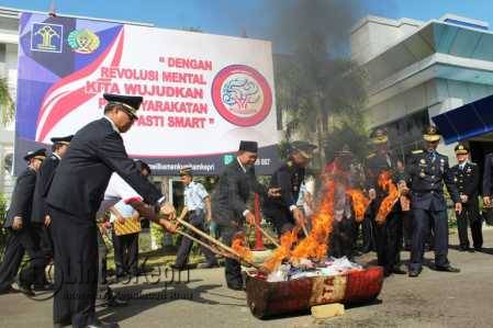 Tanjungpinang, LintasKepri.com – Kantor Wilayah Kementerian Hukum dan Hak Asasi Manusia (Kemenkumham) Provinsi Kepulauan Riau, membakar barang bukti (BB) sitaan dari hasil razia, di sejumlah Lapas dan Rutan beberapa waktu lalu, dalam rangka menyambut Hari Bakti Pemasyarakatan Ke-52, di halaman Kantor Kanwil Kemenkumham, Jalan Senggarang, Rabu (27/4).
