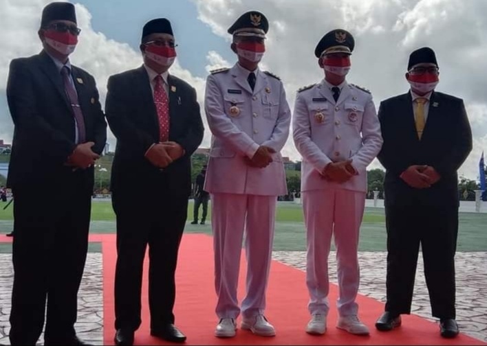 Natuna, LintasKepri.com – Bupati Natuna, Wan Siswandi, didampingi Ketua TP-PKK Natuna, Septi Dwiyani Siswandi, bertindak sebagai Inspektur Upacara detik-detik Proklamasi Kemerdekaan RI ke-76 di Lapangan Upacara Gedung Daerah Kabupaten Natuna, Selasa (17/08/2021) pagi.