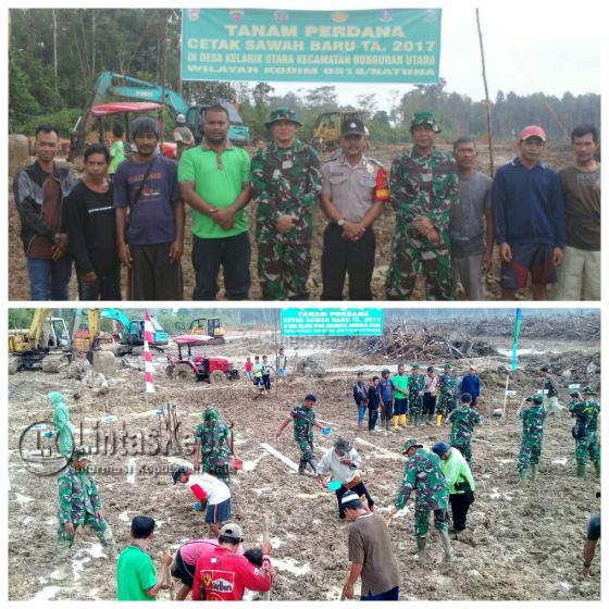 Natuna, LintasKepri.com – Komando Distrik Militer (Kodim) 0318/Natuna bekerjasama dengan Dinas Pertanian Kabupaten Natuna, kembali melaksanakan Cetak Sawah. Penanaman padi secara perdana ini, di laksanakan di Desa Kelarik Utara, Kecamatan Bunguran Utara. Minggu (31/12/2017) siang.