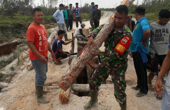 Hal ini lantas membuat Pemerintah setempat, bersama warga dan aparat keamanan seperti Bintara Pembina Desa (Babinsa), ikut berpartisipasi dalam melakukan perbaikan jembatan yang rusak. Rabu (04/12/2019) siang.