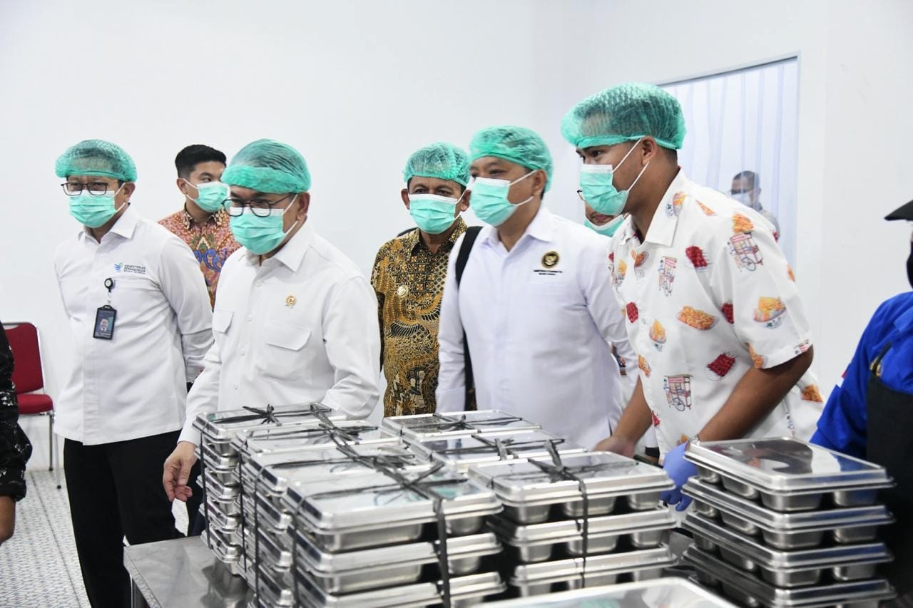 Bersama Gubernur Kepri, Ansar Ahmad, Mendag Budi mengamati seluruh proses produksi, mulai dari persiapan bahan baku, pengolahan makanan, distribusi ke penerima manfaat, hingga memastikan makanan higienis dan layak konsumsi.