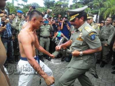 Sebelum dipukul oleh kepala Daerah tersebut, ketiga anggota Satpol tersebut menggelar antraksi dan unjuk kebolehan di depan para pejabat yang hadir, mereka mengadu kekuatan ketahanan tubuh dengan memecahkan Batako dan Batu Es melalui media Sikut, dan Kepala.