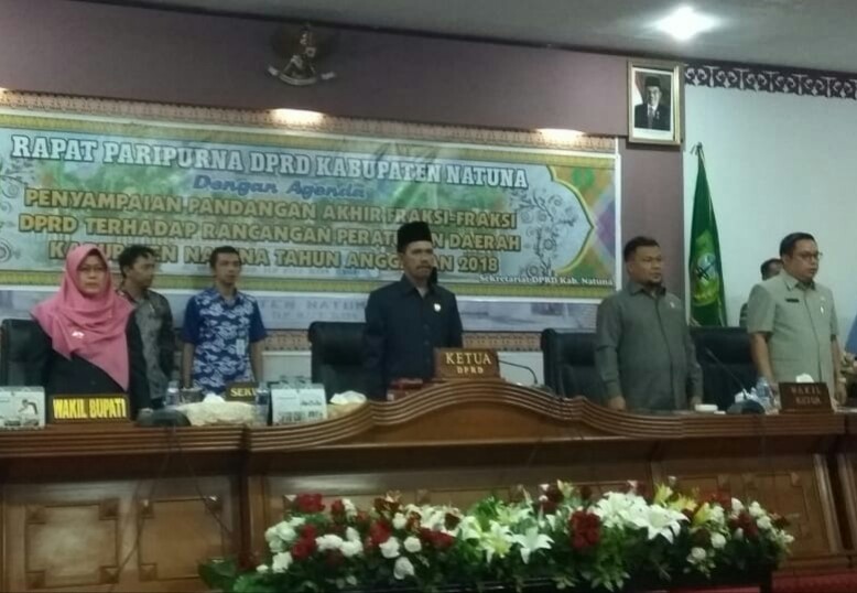 Adapun 6 (enam) Ranperda yang disetujui adalah sebagai berikut, 1. Ranperda tentang Pengelolaan Limbah Domestik, 2. Ranperda tentang Kawasan Tanpa Rokok, 3. Ranperda tentang Penyelenggaraan Penanaman Modal Daerah, 4. Ranperda tentang Barang Milik Daerah, 5. Ranperda tentang Retribusi Perpanjangan Izin Mempekerjakan Tenaga Kerja Asing, 6. Ranperda tentang Laporan Pertanggungjawaban Pelaksanaan APBD Kabupaten Natuna Tahun Anggaran 2017.