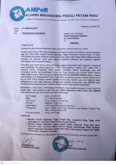 Pekanbaru, LintasKepri.com – Mahasiswa yang tergabung dalam Aliansi Mahasiswa Peduli Petani Riau (AMPeR) Akan turun kejalan melakukan aksi menuntut Kajati Riau memeriksa Kepala Kejaksaan Negeri Kuansing pada hari Kamis tanggal 22 April 2021 mendatang.